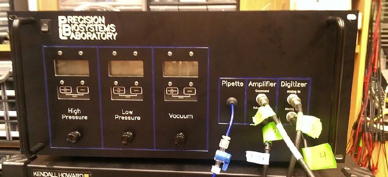 While applying positive pressure to keep the tip clear of debris, the robot precisely lowers a small glass pipette into the brain. When the pipette tip gets near a neuron of interest (characterized by an increase in electrical impedance), a small amount of suction is applied in order to make contact with the cell membrane. Once this contact has been made, quick pulses of high suction are applied to break through membrane and create a “whole-cell patch”. The whole-cell patch allows neuroscientists to listen in on and record the cell’s electrical activity. A video explanation can be found here.