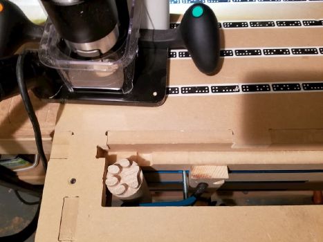 The flat panels were cut from 1/2" birch plywood using a handheld CNC router. For the legs, I first built a vertical jig which was subsequently used to cut paw shapes into 2" wooden dowels.