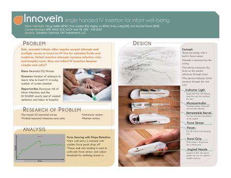 For the Georgia Tech’s Fall 2013 Capstone Design Expo, our team designed a handheld tool for assisting nurses with the insertion of needles into neonates. A force sensor detects a sudden decrease in force as the needle breaks through the vein wall. This event is indicated to the user visually with an LED.