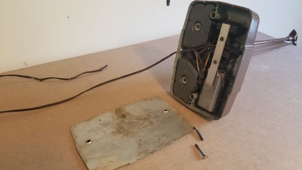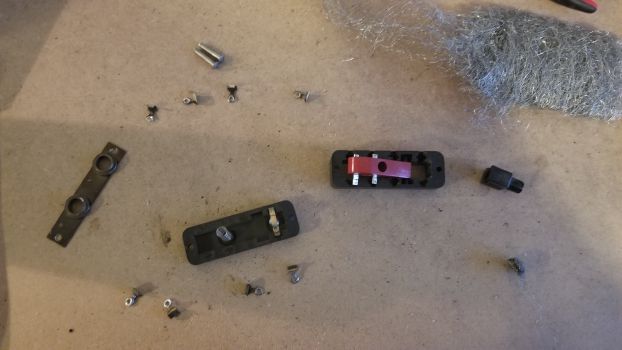I removed the two-button on/off switch. Testing continuity with a multimeter showed that it was not making solid electrical connections, so I took it apart and cleaned up the contacts with steel wool and isopropyl alcohol.