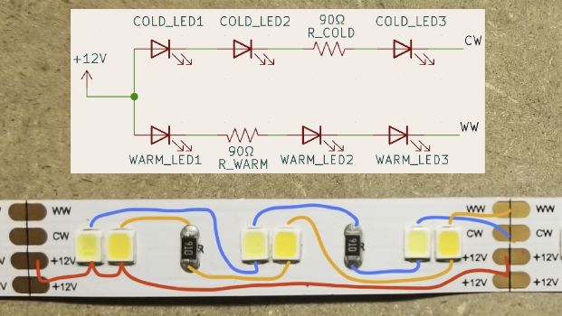 I wanted to reverse engineer the circuit so that I could power and adjust the lighting with my own custom circuit board instead of relying on the included module and remote. Each segment of the strip has 6 LEDs (3 warm and 3 cool). Some probing around with a multimeter revealed that the LEDs were divided into parallel warm and cool circuits, each consisting of 3 LEDs in series with a current limiting resistor.