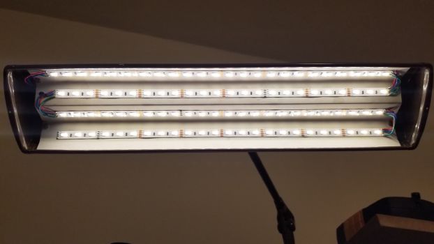 Luckily my circuit breaker did its job and cut power to the electrical socket, thereby preventing any damage, but I was left with a defunct lamp that needed a new power cord. I figured since I needed to replace the cord, it would be fun to go ahead and make some modifications to the lamp while I was at it. I decided to ditch the fluorescent bulbs and upgrade them to LEDs, with color temperature and brightness adjustments to boot.
