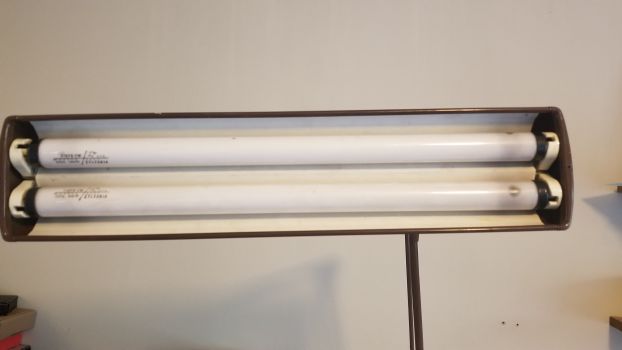 I came into posession of my grandfather’s old desk lamp. It is a hefty Dazor P-2324-16 lamp with two fluorescent bulbs.
