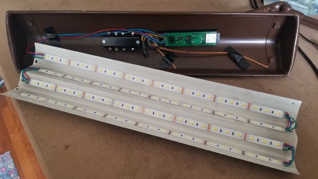 I first ordered some white LED strip lighting. This stuff is pretty amazing. It is a long thin strip of flexible circuit board that comes in a roll. You can unroll and cut the strip to your desired length and then stick it to whatever surface you like. My roll came with both warm and cool white LEDs, and a remote control for adjusting brightness and color temperature.