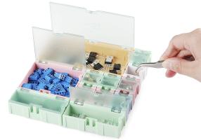 I use these boxes to organize all of my small components. They come in various sizes and can be slotted together to create project specific storage grids.